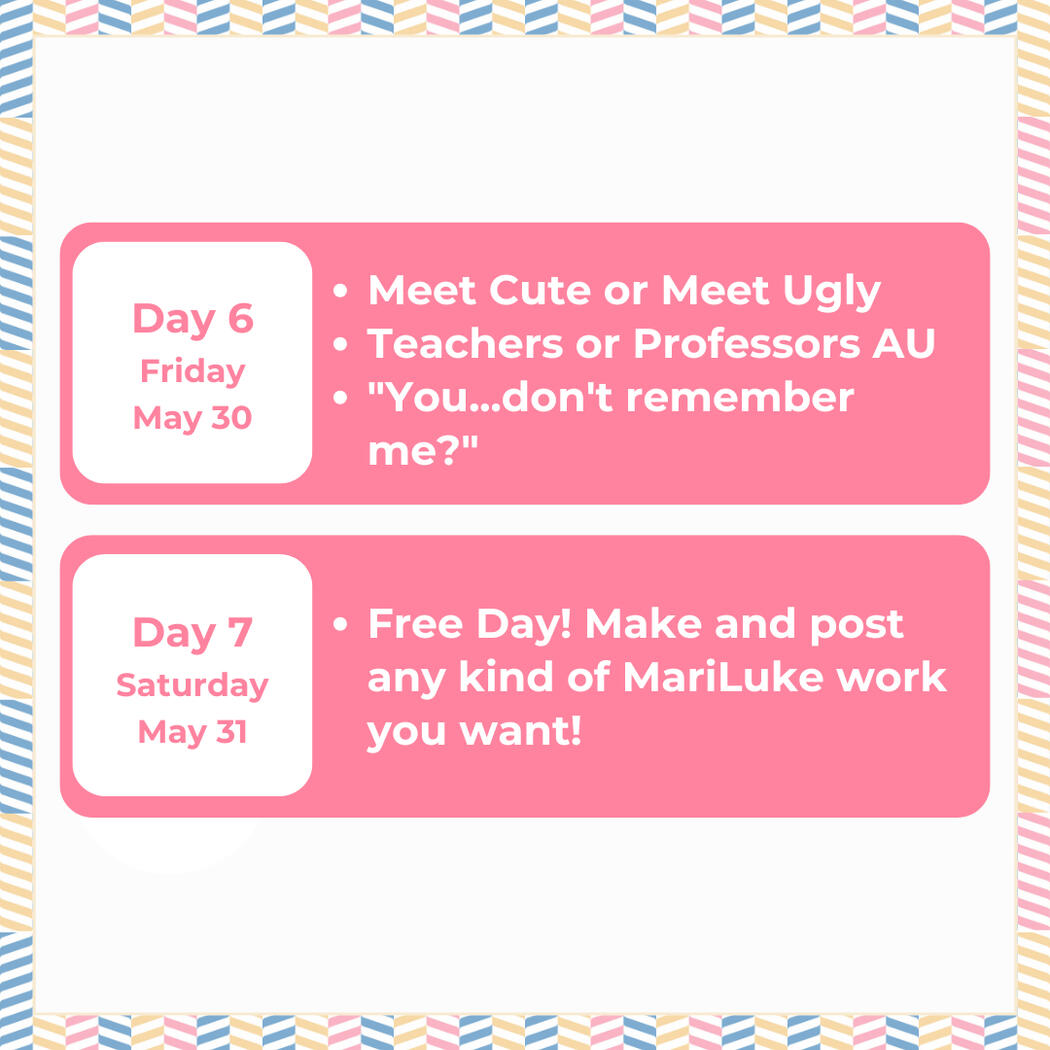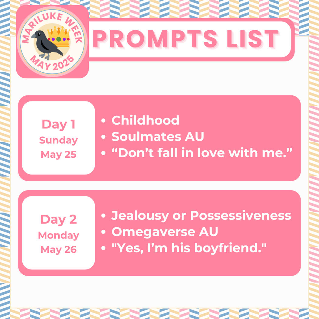 MariLuke Week is a fan week dedicated to the ship Marius/Luke or Luke/Marius, both dynamics included. MariLuke Week 2025 happening in May will be our 2nd run of this event, and we're so excited to be back!This event will allow SFW and NSFW entries of fanfic, fanart, photo edits/collages, and videos made according to certain prompts. So long as you made it and it fits one of the prompts, itโs more than welcome for this event! For more information, please check out the other pages on this carrd.Let's make this a fun week! #MariLukeWeek2025