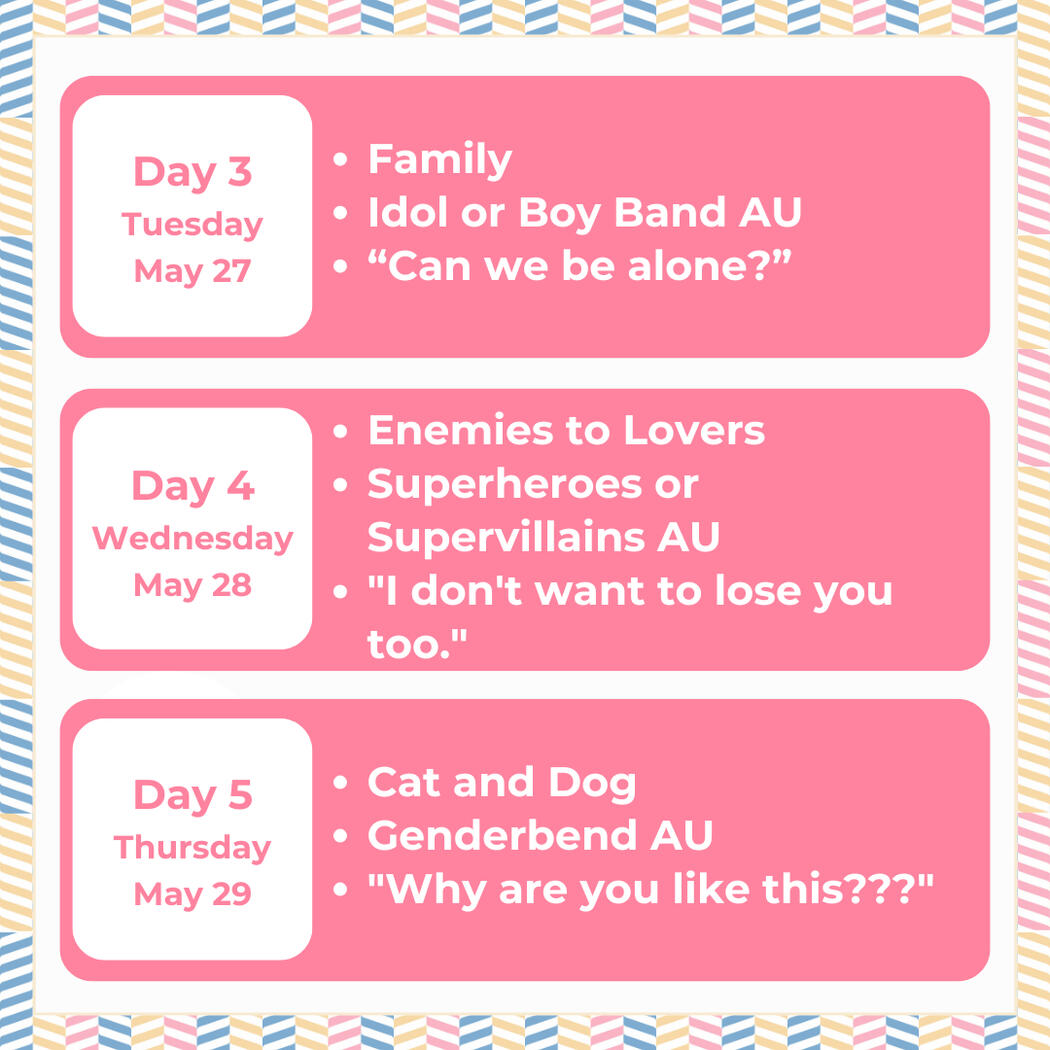 Make sure to add the day and prompt of your work in your post (ex. Day 1: First Kiss)